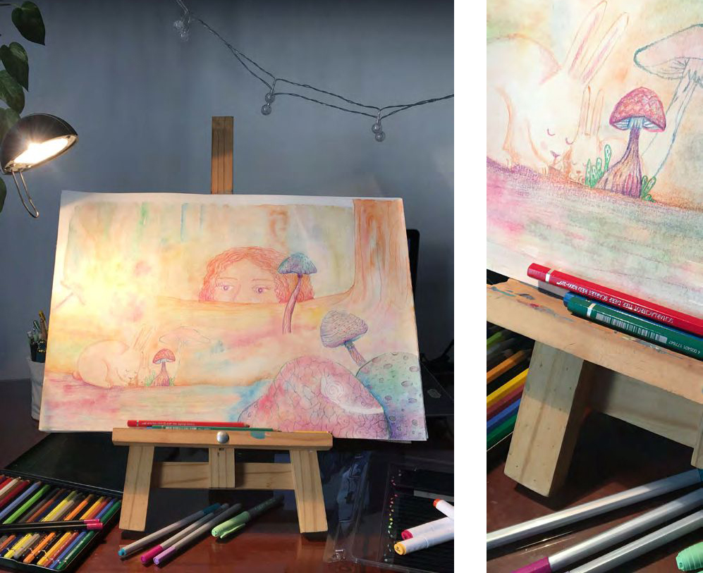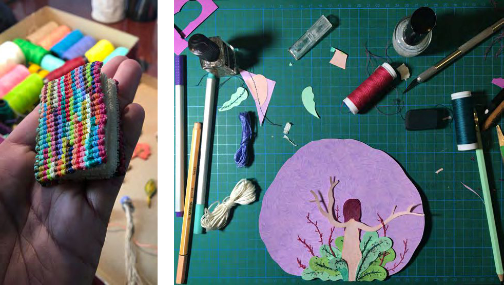 Me gusta combinar técnicas. Utilizo el papel de varias formas: para hacer collage, para bordarlo, calarlo, o pintarlo. Tengo: hilos para hacer macramé bi y tridimensional; lápices y marcadores de colores; a veces acrílicos. En algunas ocasiones me gusta fusionar arte analógico con digital.