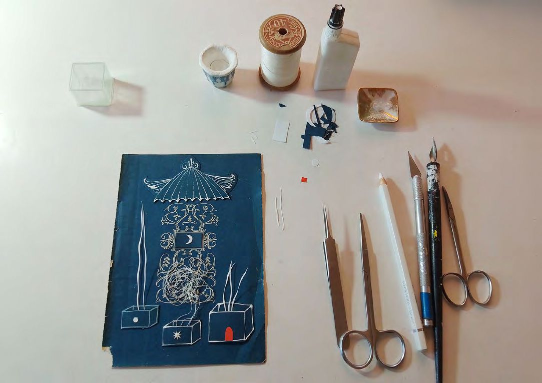 Todo mi trabajo gira en torno a materiales analógicos: papeles e hilos. Intervengo el papel con lápices, collage, sellos y esténcil.