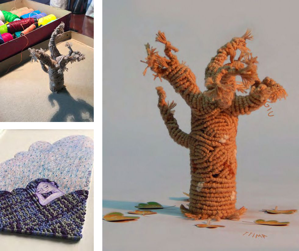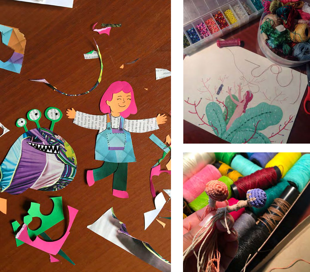 Me gusta combinar técnicas. Utilizo el papel de varias formas: para hacer collage, para bordarlo, calarlo, o pintarlo. Tengo: hilos para hacer macramé bi y tridimensional; lápices y marcadores de colores; a veces acrílicos. En algunas ocasiones me gusta fusionar arte analógico con digital.